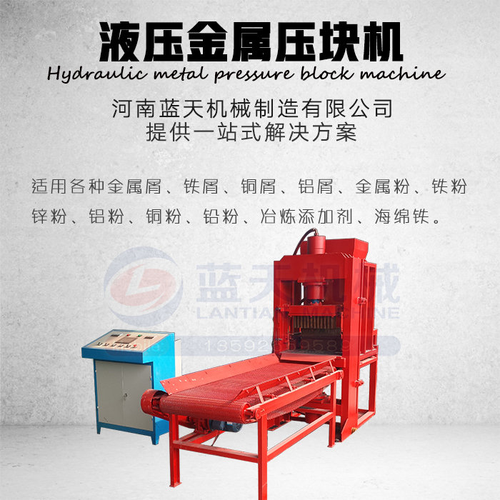 河南藍天機械制造有限公司研發(fā)生產(chǎn)的液壓金屬壓塊機主要用于把粉碎后的金屬粉末尺寸小于1mm的金屬顆粒群,通過大壓力將各種金屬廢料直接冷壓成型,便于儲藏、運輸及回收再利用。
