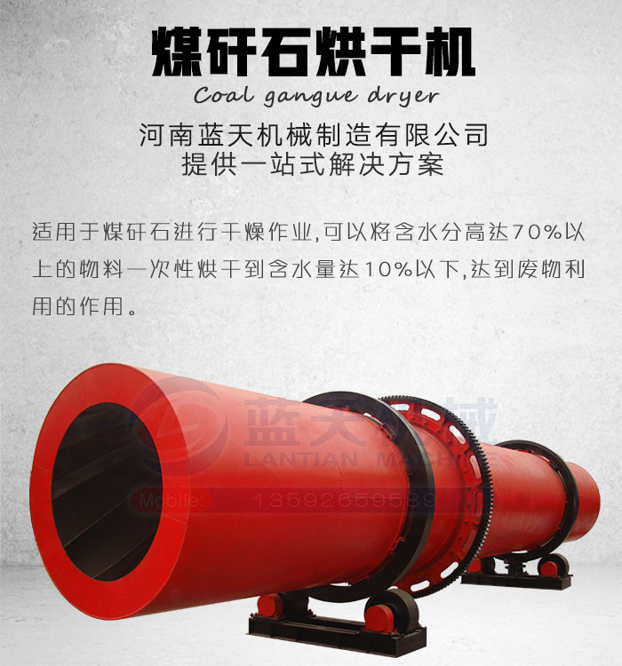 煤矸石是采煤過程和洗煤過程中排放的固體廢物,作為礦業(yè)固體廢物的一種,煤矸石棄置不用,占用大片土地,而煤矸石烘干機的出現(xiàn)可將其“變廢為寶”,使其產生巨大的利用價值。河南藍天機械制造有限公司生產的煤矸石烘干機對煤矸石烘干有很好的效果,以其熱效率高、生產能力大、使用壽命長等優(yōu)勢被國內外用戶所喜愛。煤矸石是采煤過程和洗煤過程中排放的固體廢物,作為礦業(yè)固體廢物的一種,煤矸石棄置不用,占用大片土地,而煤矸石烘干機的出現(xiàn)可將其變廢為寶,使其產生巨大的利用價值。河南藍天機械制造有限公司生產的煤矸石烘干機對煤矸石烘干有很好的效果,以其熱效率高、生產能力大、使用壽命長等優(yōu)勢被廣大用戶所喜愛,是建材設備中收益回收快的設備,設備型號齊全、工作能力強,值得投資。
