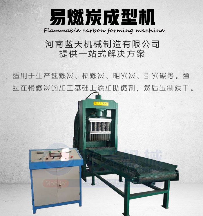 易燃碳成型機(jī)是由河南藍(lán)天機(jī)械制造有限公司運(yùn)用轉(zhuǎn)化技術(shù),將生物質(zhì)材料經(jīng)炭化粉碎后成型的成型設(shè)備。易燃炭是為方便野外燒烤使用而生產(chǎn)的一種速燃炭、引火碳、快速點(diǎn)火碳等,主要用于戶外燒烤快速引燃。